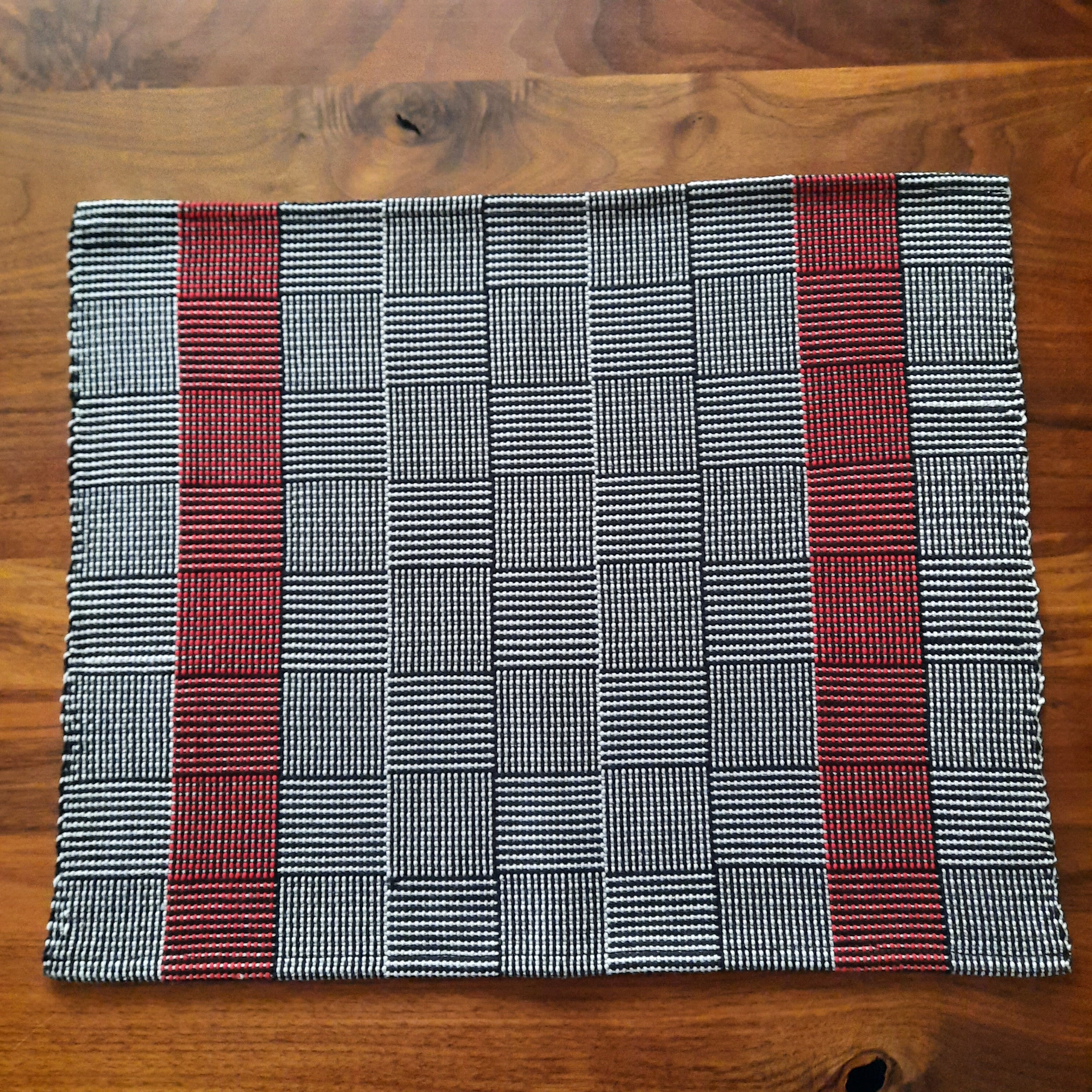 Dieser Webstuhl und dieses Projekt eignet sich sehr gut für Einsteiger:innen.für Tischsets oder Läufer in weiss und grau.